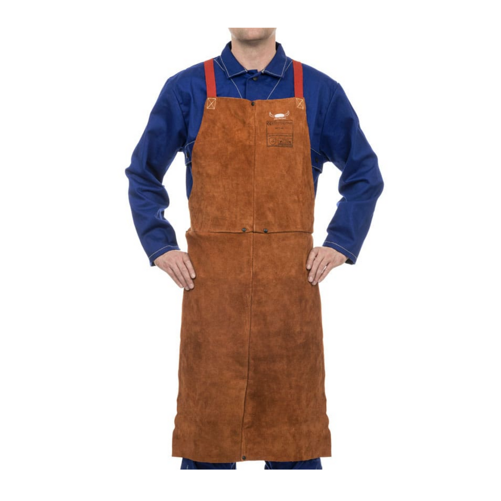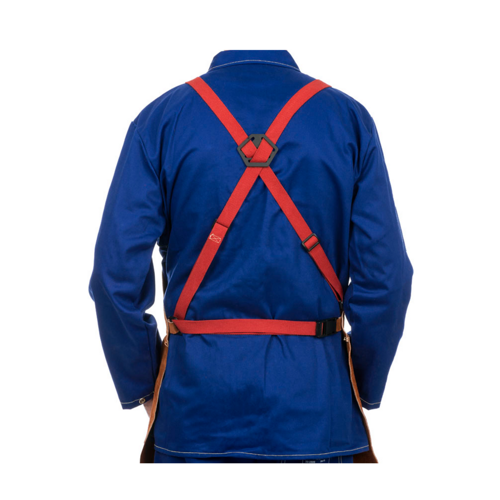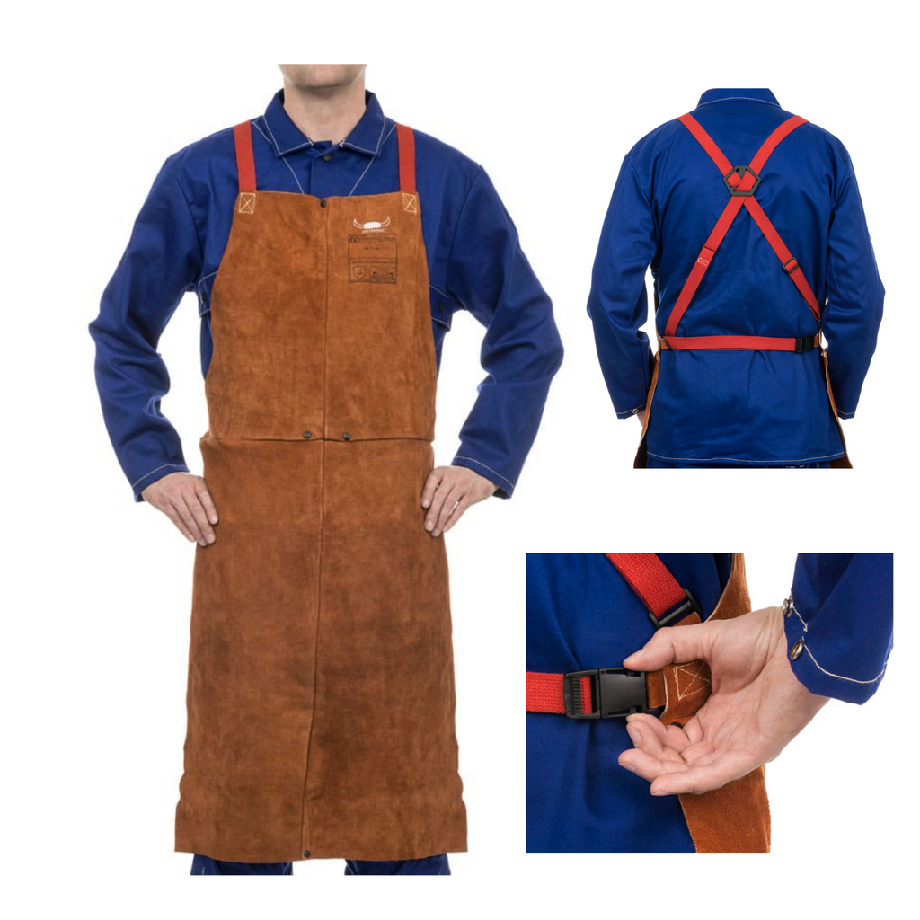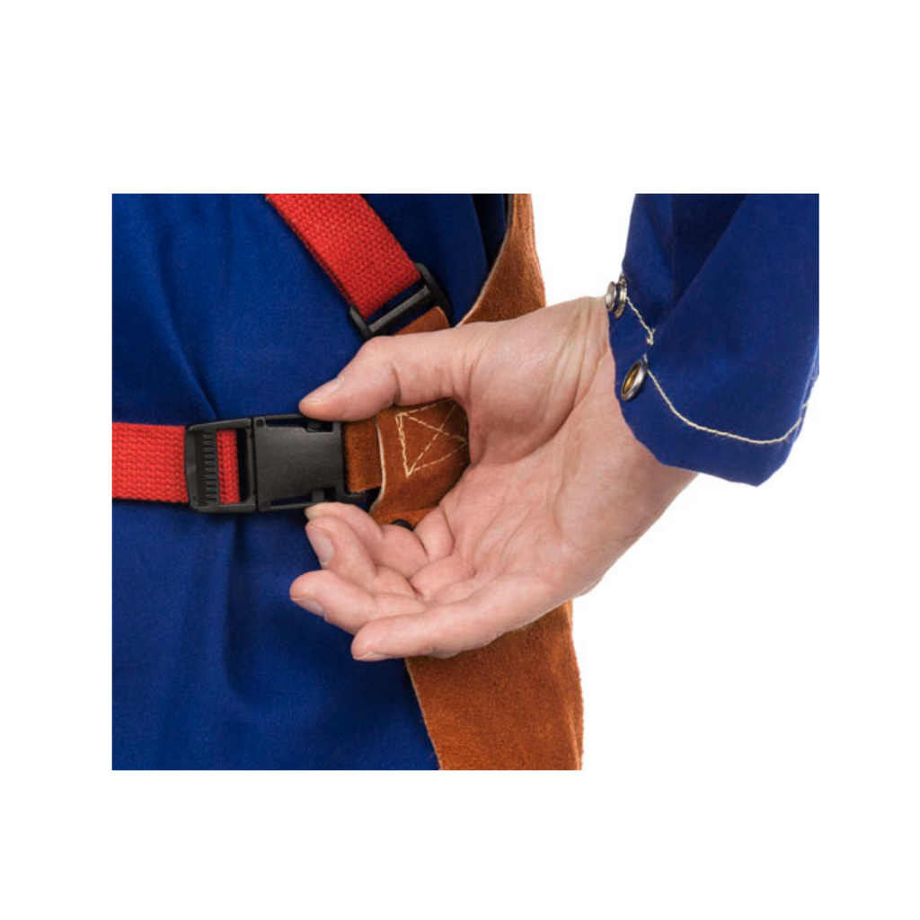 Grembiule di protezione per saldatore, in pelle crosta. 80mm x 107mm di lunghezza di protezione complessiva. Con sistema di regolazione a cinghie.